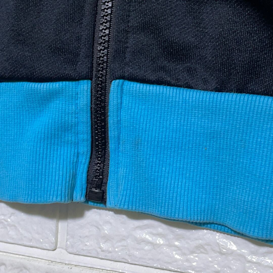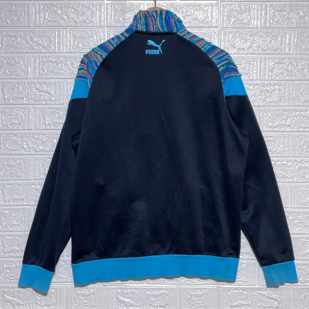 クージーとプーマのコラボによるトラックジャケットは、水色とブラックの配色に立体的な編込みが映える特別な一着です。