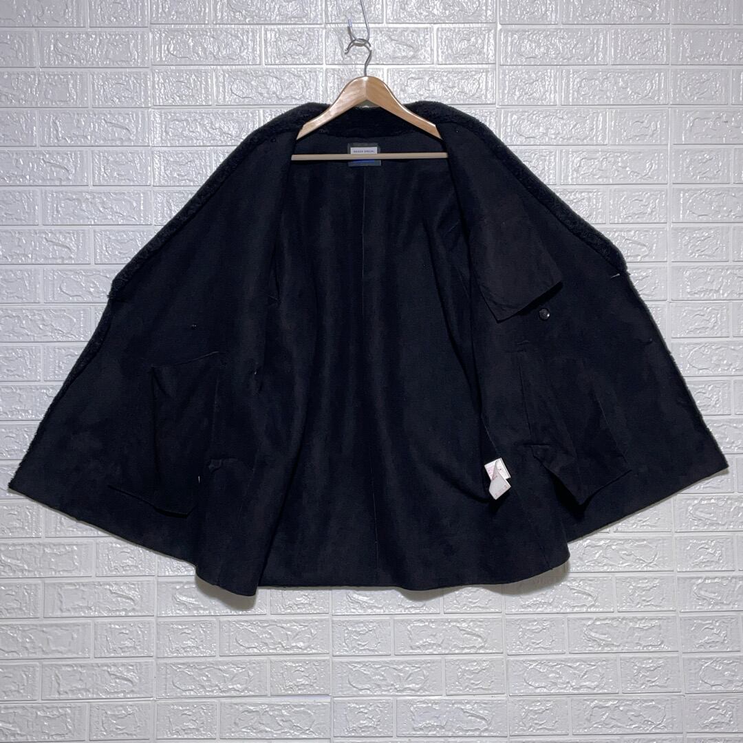スーパーオーバーサイズのラグランスリーブでリラクシングながらも品格を保持し、大きな襟や光沢ある表面、水牛ボタンが上質さを演出します。