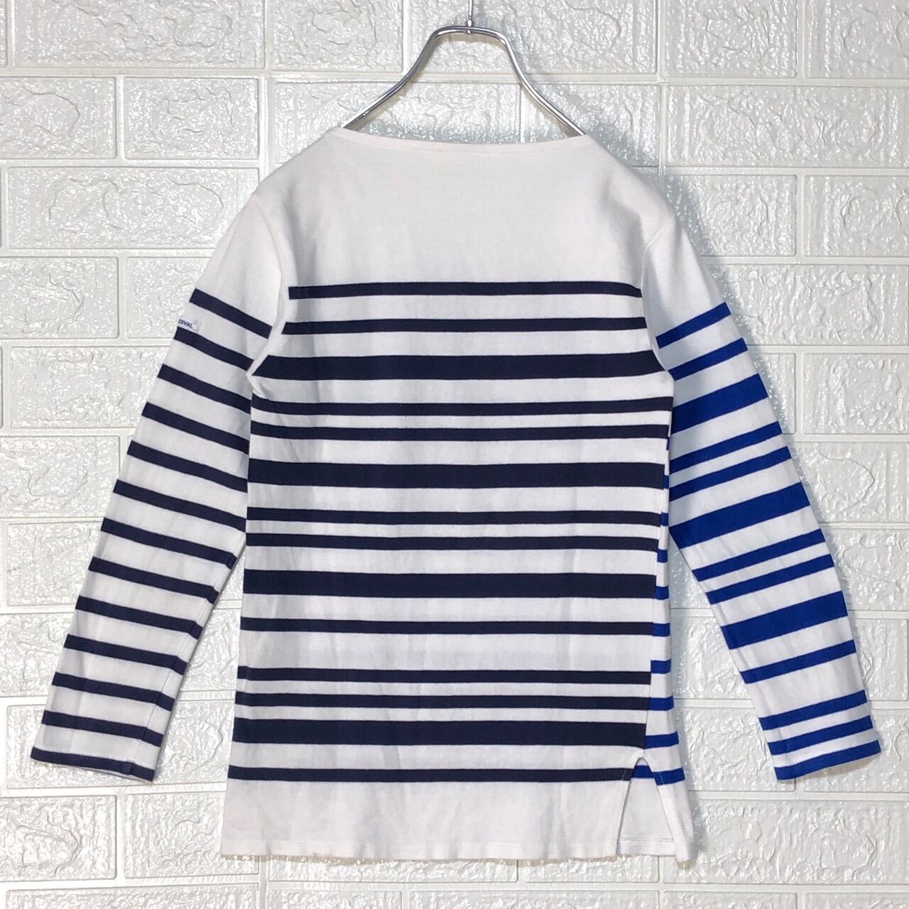 横に広がるボートネックやサイドスリットなど、伝統的なディティールを取り入れつつ、ブルーとネイビーの切り替えボーダーが爽やかさを演出します。