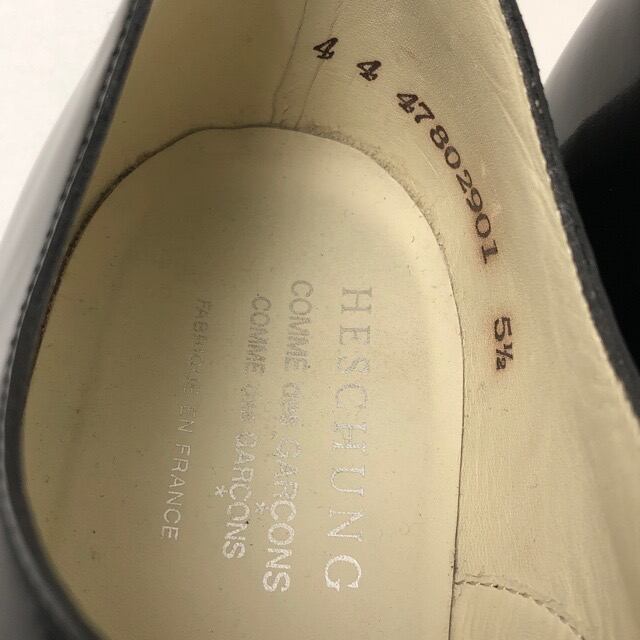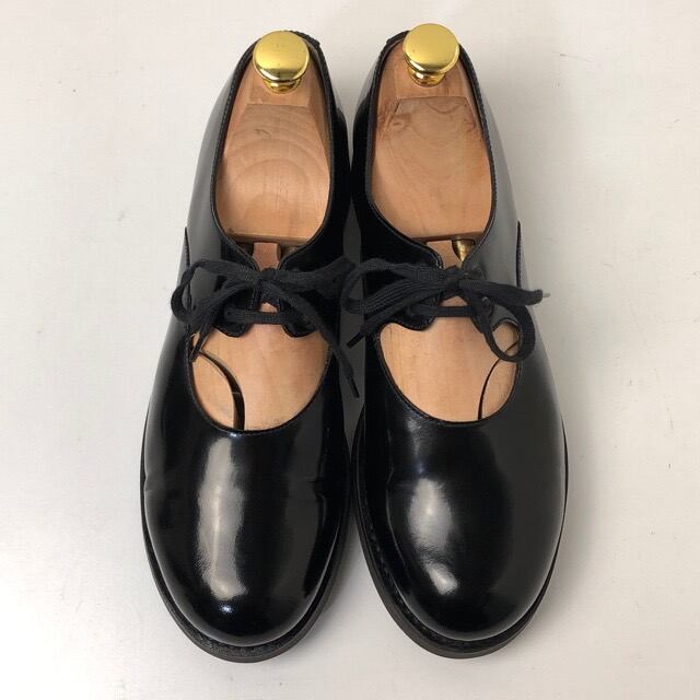 コムデギャルソンとエシュンのコラボレーションによるオルガンシューズは、ブラックのエナメル素材を使用したツーホールデザインで、シンプルかつ洗練されたスタイルが特徴です。
