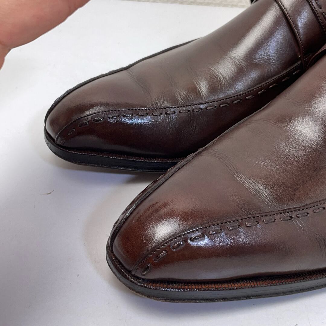 一般的な着用感は見られるものの目立った傷や汚れはなく、比較的きれいです。サービスの一環として靴磨き、トゥとヒールに物が映り込むほどピカピカに、鏡面磨きを施しています。