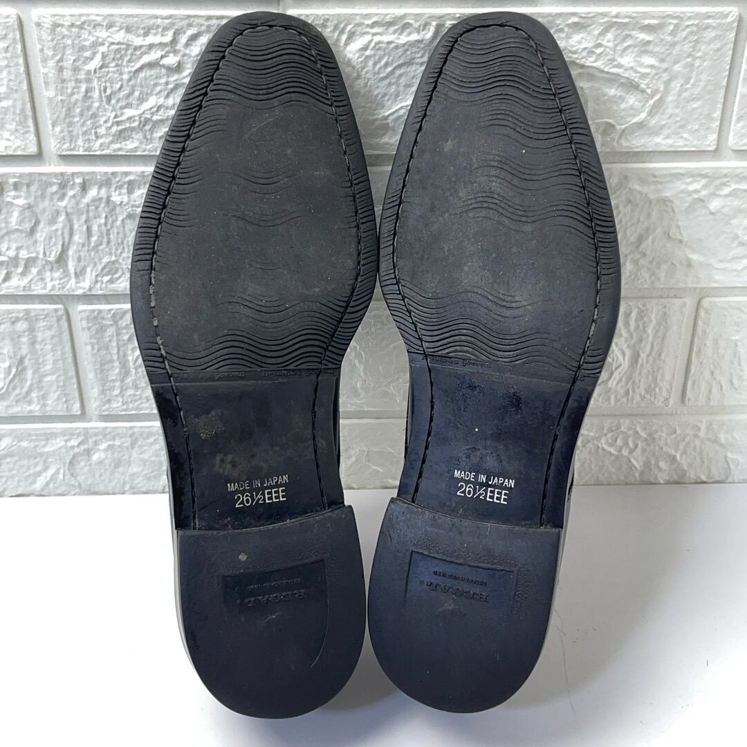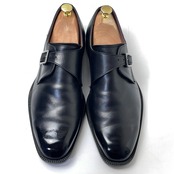 一般的な着用感は見られるものの目立った傷や汚れはなく、比較的きれいです。サービスの一環として靴磨き、トゥとヒールに物が映り込むほどピカピカに、鏡面磨きを施しています。