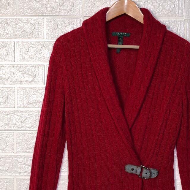 鮮やかなレッドとケーブル編みのデザインが印象的です。
