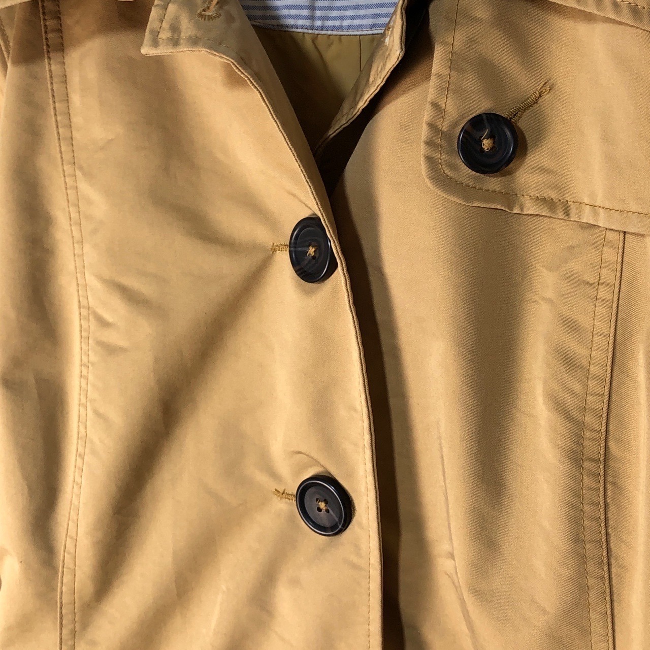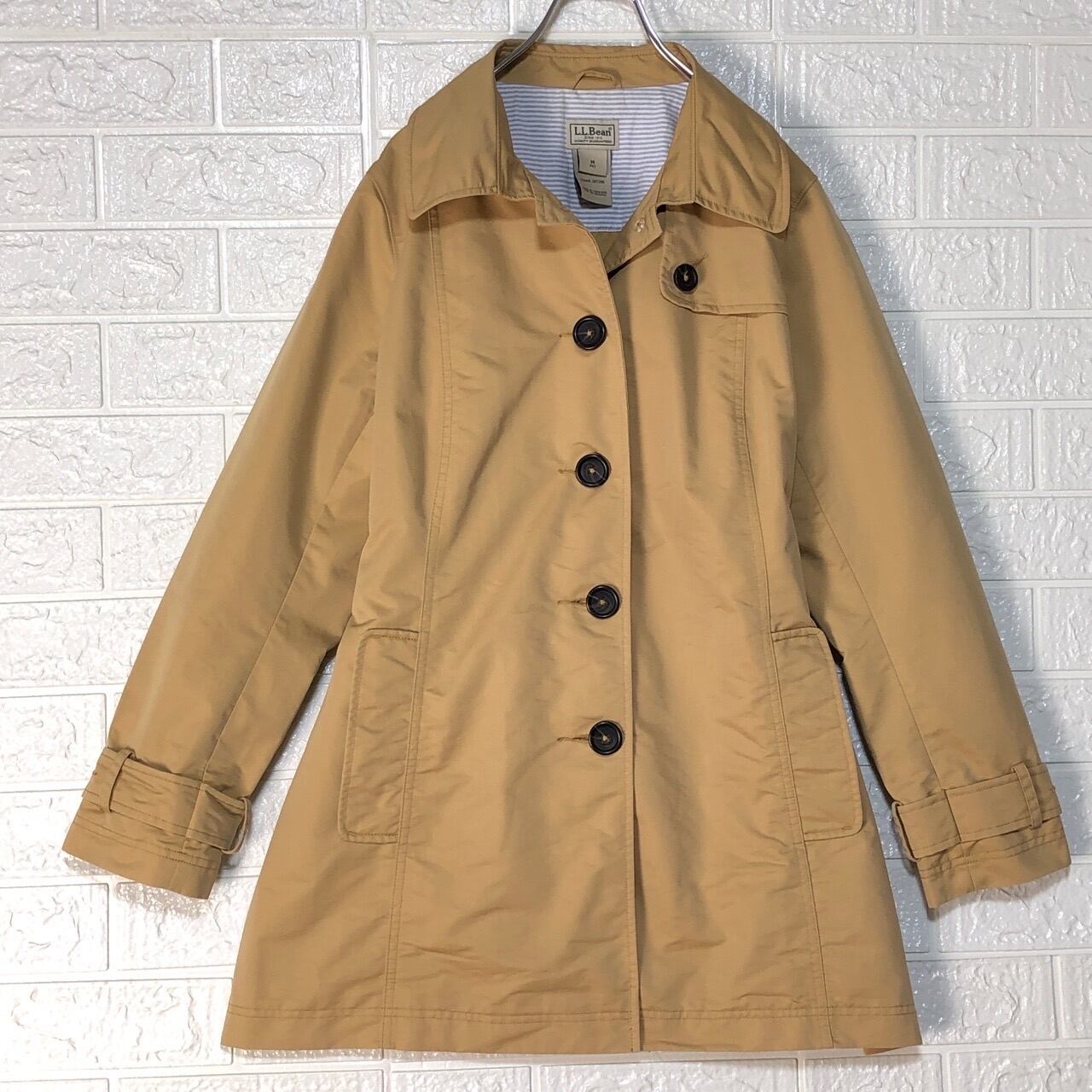 エルエルビーンのステンカラーコートは、ベージュの落ち着いた色味に裏地ボーダーがアクセント。