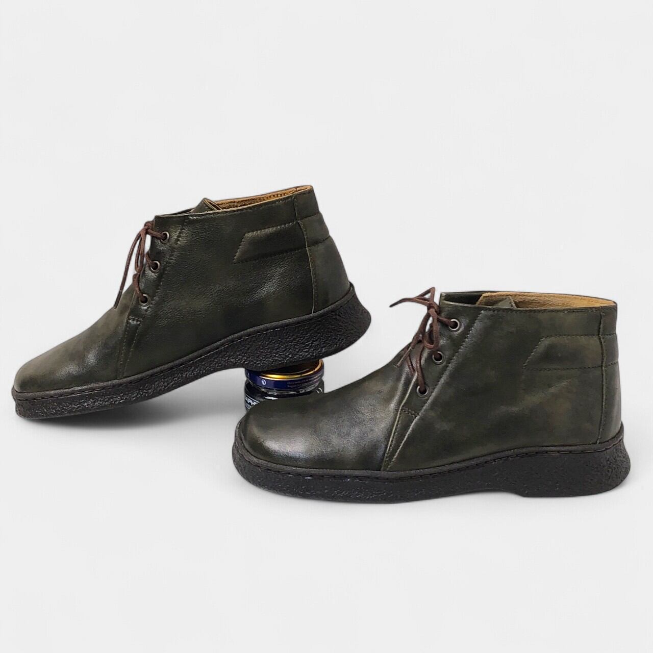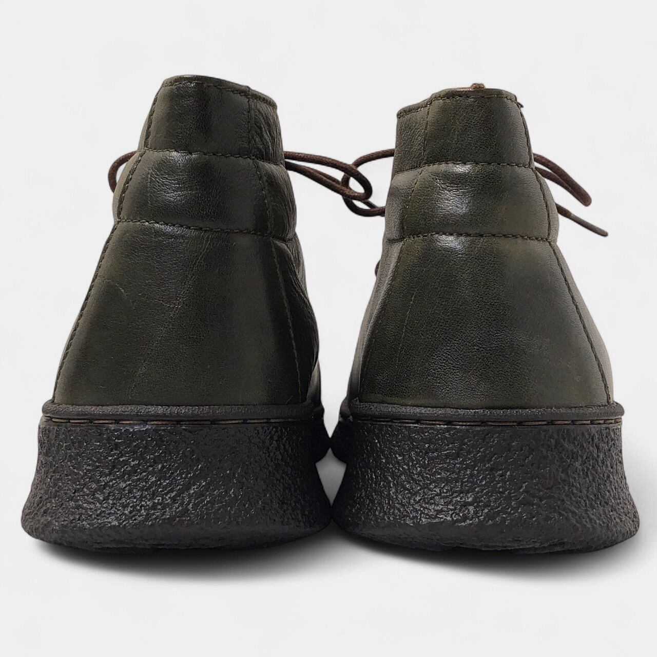 オリーブカラーの落ち着いた印象のブーツ。