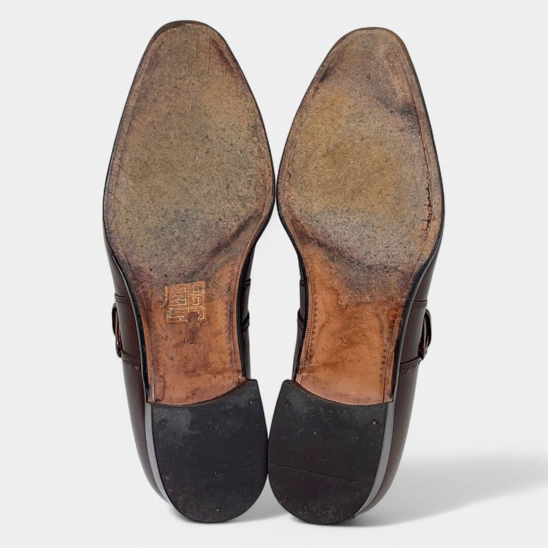 一般的な着用感は見られるものの目立った傷や汚れはなく、比較的きれいです。サービスの一環として靴磨き、トゥとヒールに物が映り込むほどピカピカに、鏡面磨きを施しています。
