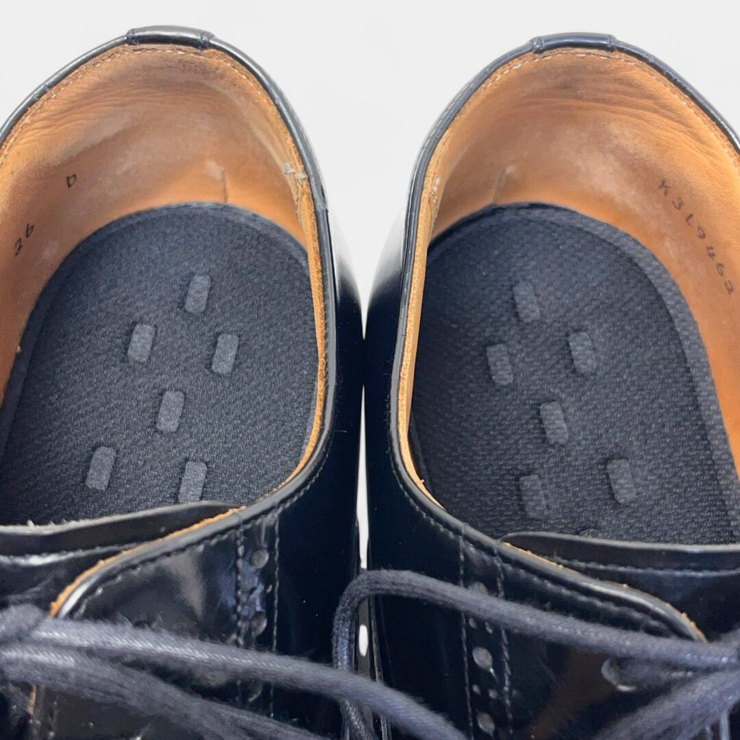 サイドに傷が見られますが、そこまで目立つものではありません。サービスの一環として靴磨き、トゥとヒールに物が映り込むほどピカピカに、鏡面磨きを施しています。