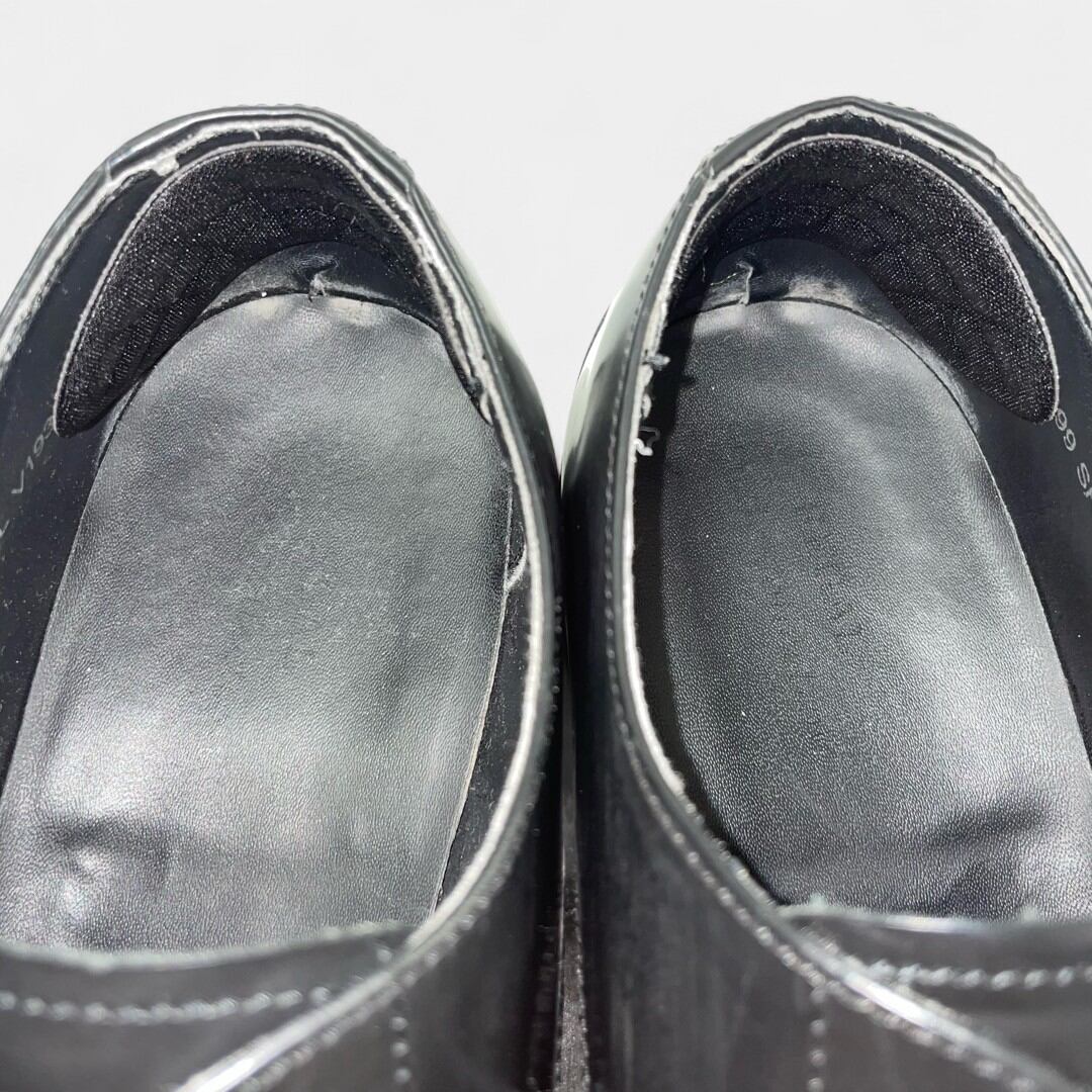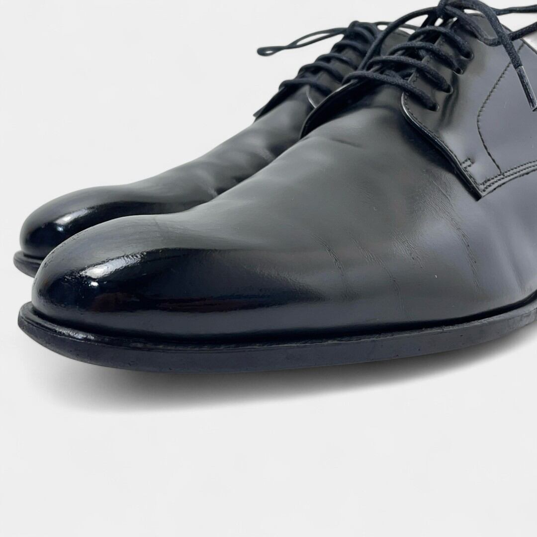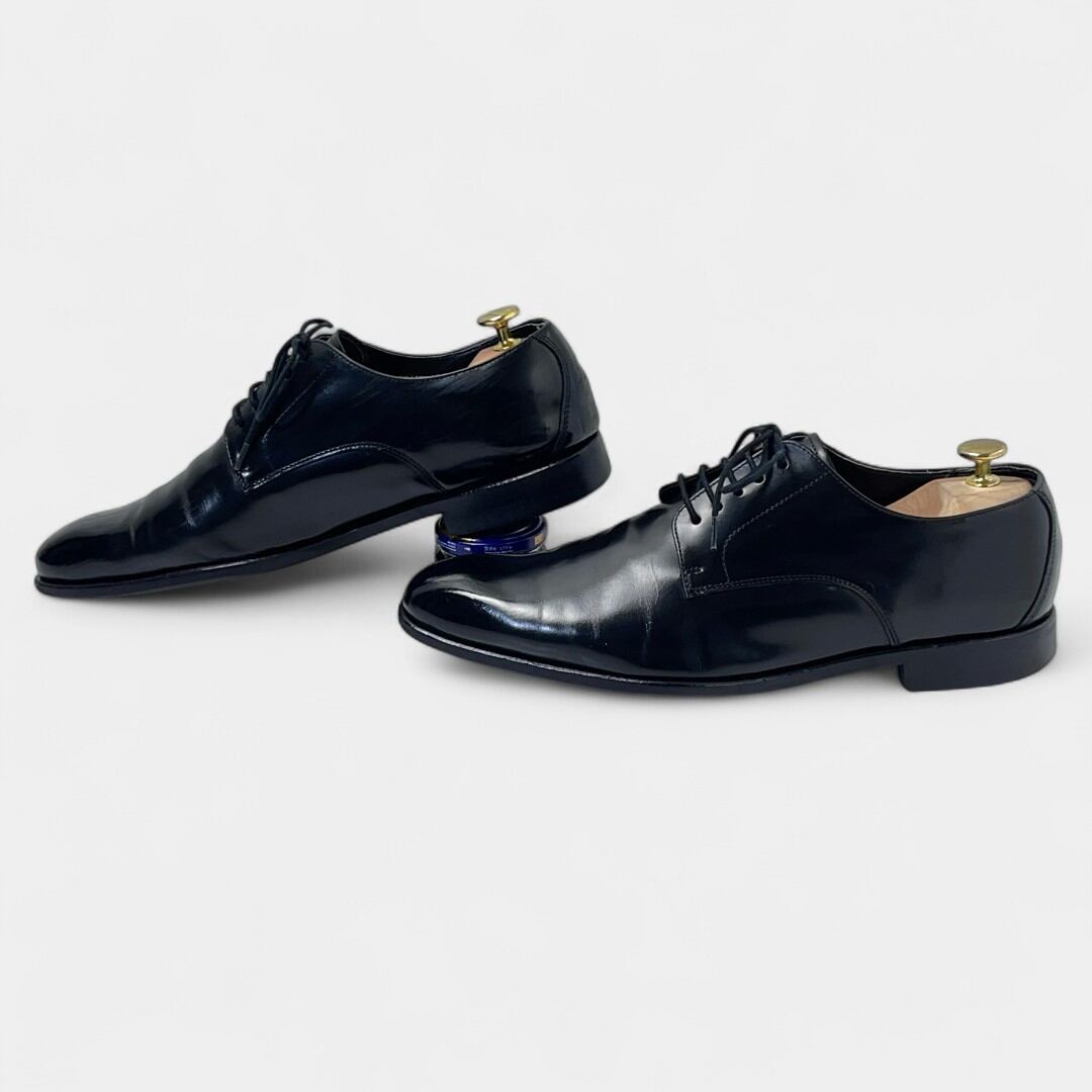 一般的な着用感は見られるものの目立った傷や汚れはなく、比較的きれいです。サービスの一環として靴磨き、トゥとヒールに物が映り込むほどピカピカに、鏡面磨きを施しています。