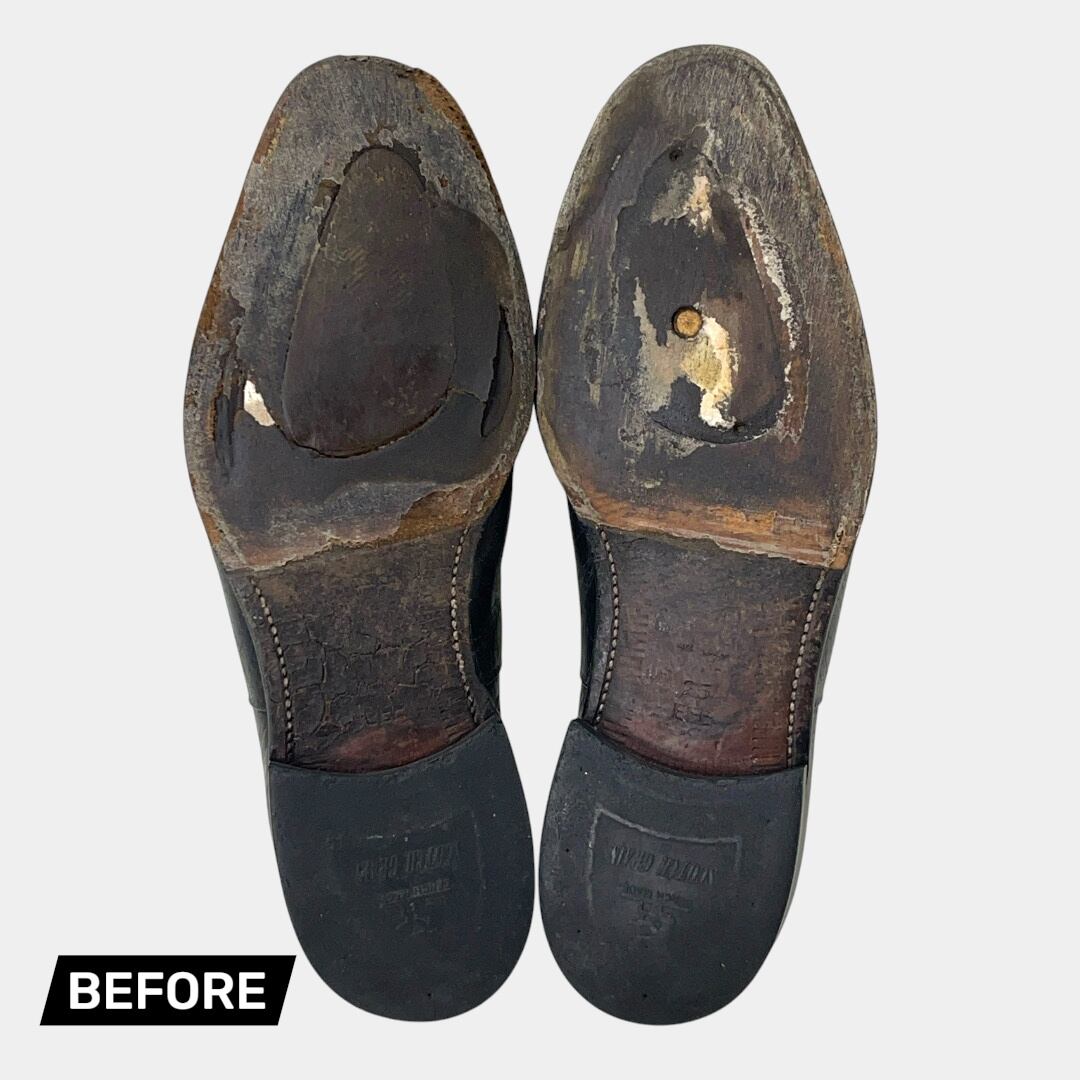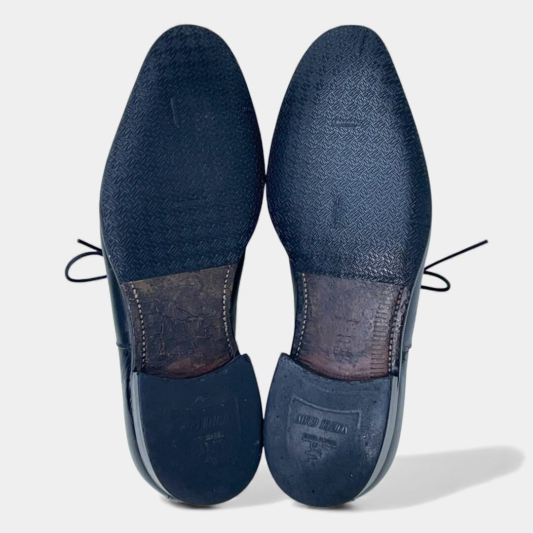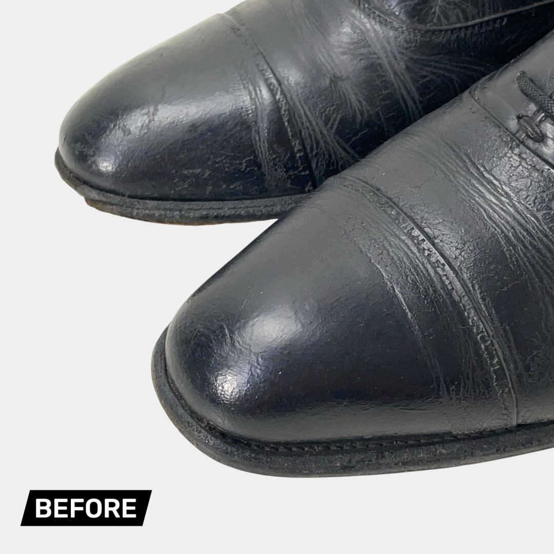 一般的な着用感は見られるものの目立った傷や汚れはなく、比較的きれいです。サービスの一環として靴磨き、トゥとヒールに物が映り込むほどピカピカに、鏡面磨きを施しています。