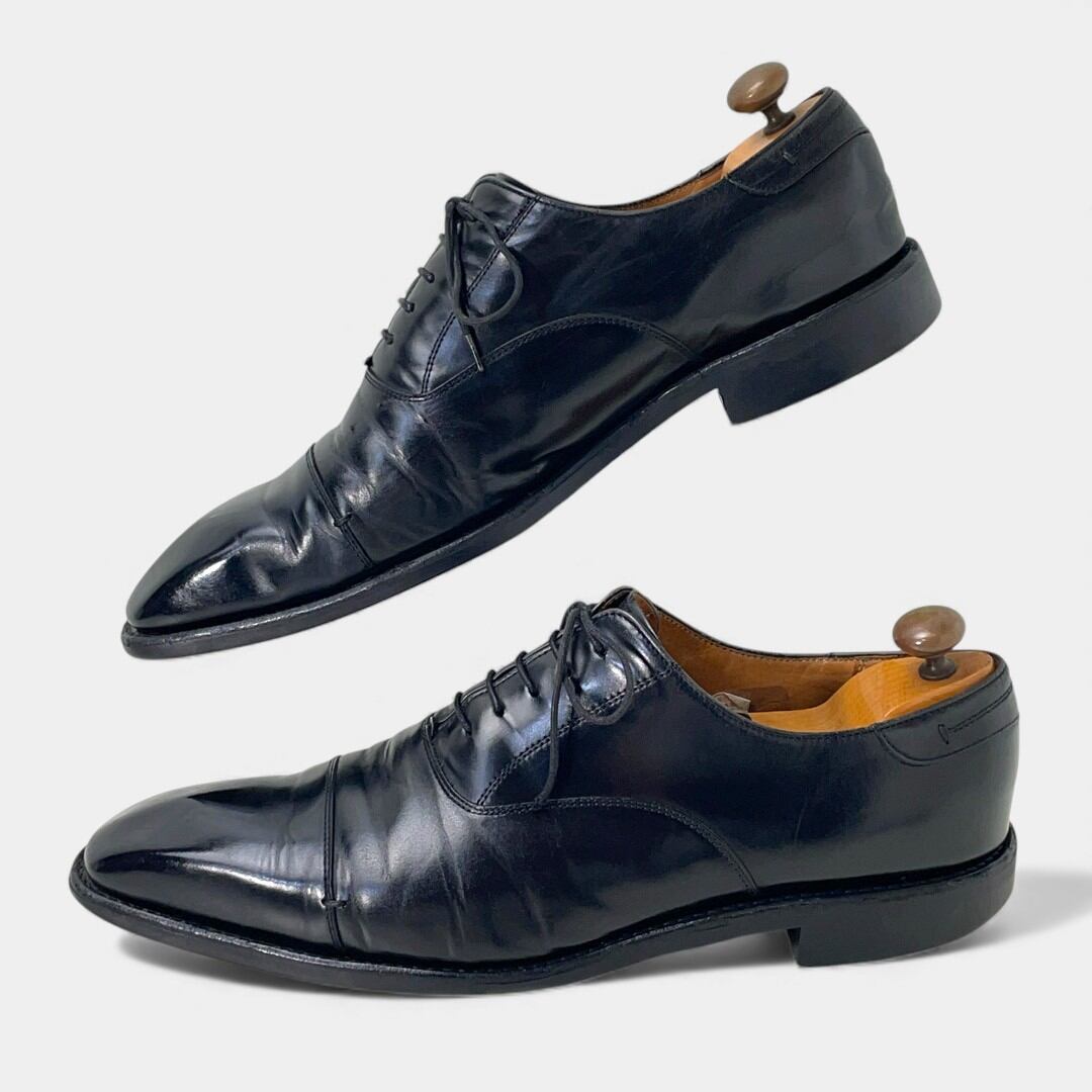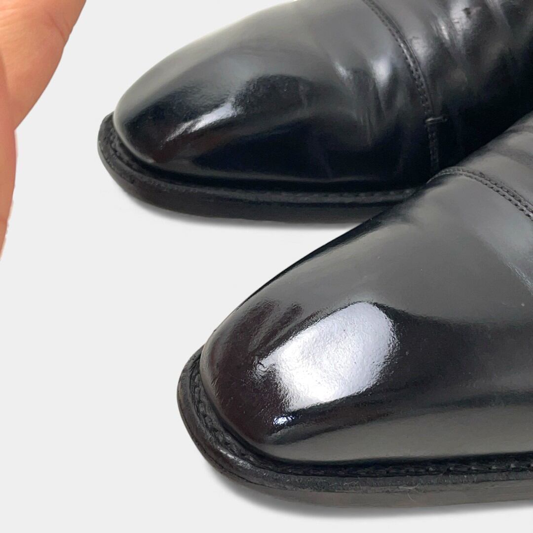 一般的な着用感は見られるものの目立った傷や汚れはなく、比較的きれいです。サービスの一環として靴磨き、トゥとヒールに物が映り込むほどピカピカに、鏡面磨きを施しています。