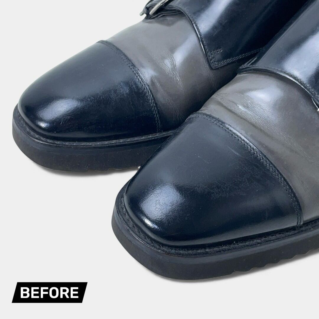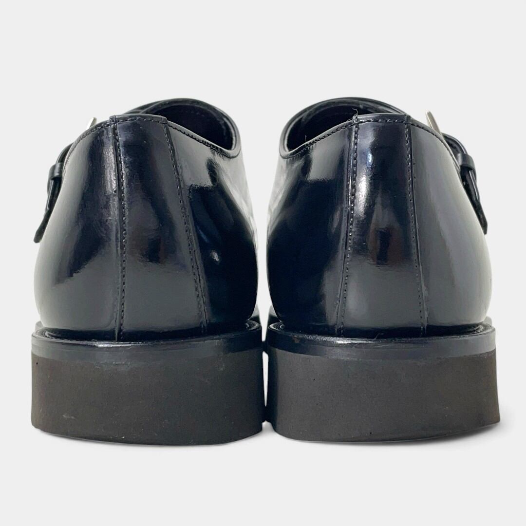 一般的な着用感は見られるものの目立った傷や汚れはなく、比較的きれいです。サービスの一環として靴磨き、トゥとヒールに物が映り込むほどピカピカに、鏡面磨きを施しています。