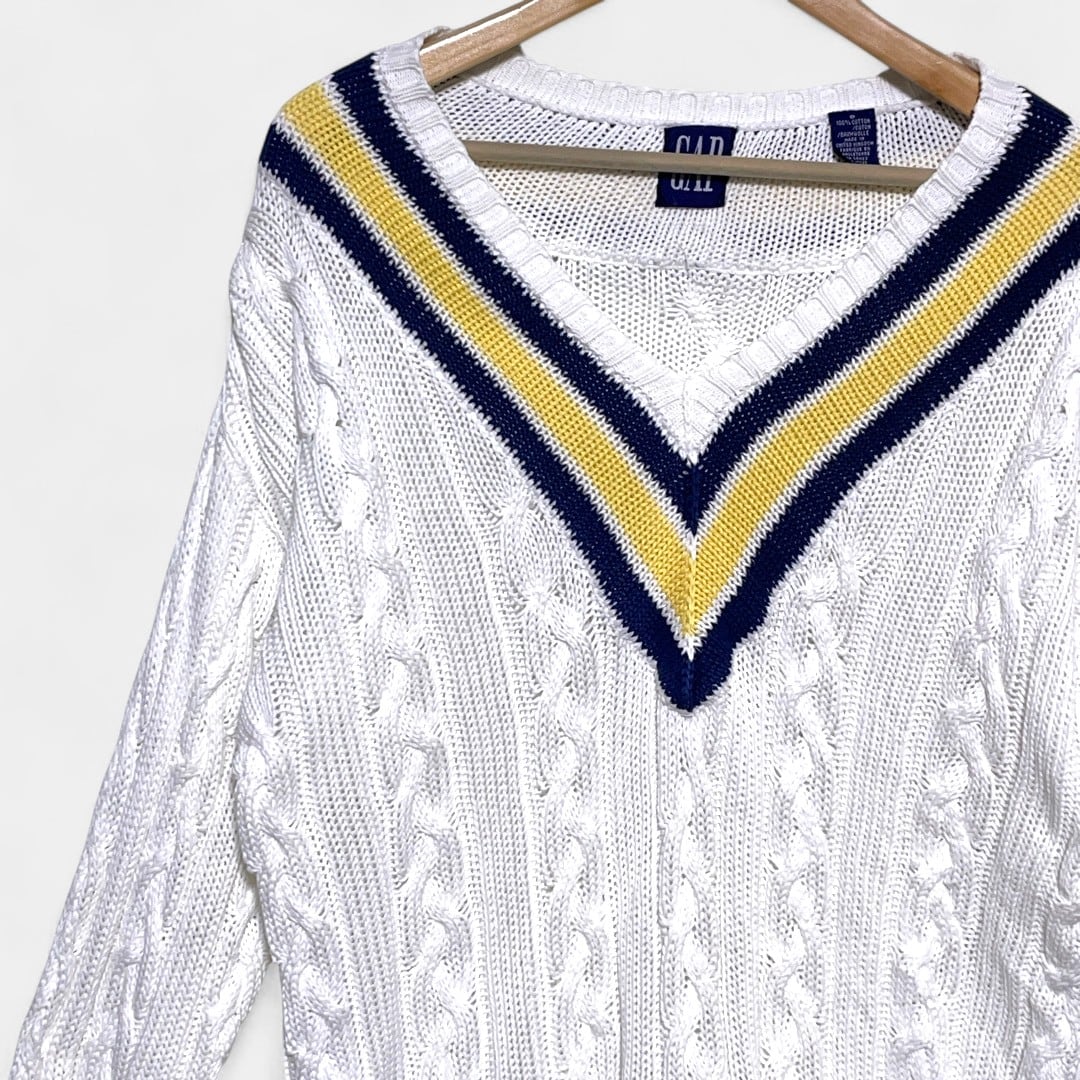 オールド ギャップ チンデル ニット ホワイト Vネック オーバーサイズ ビンテージ ミドルゲージ ケーブル編み